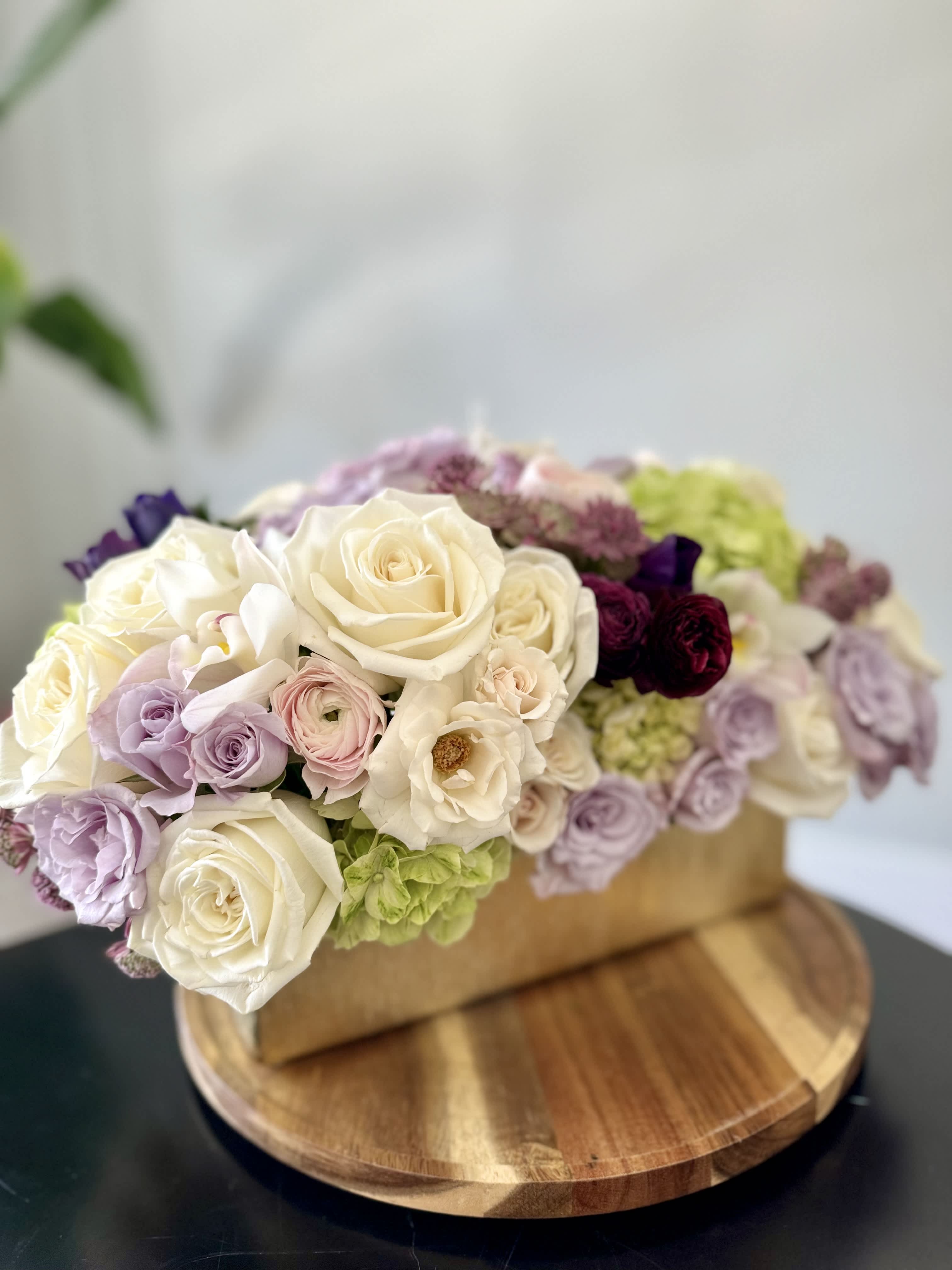 A lush a full arrangement with roses, ranunculus, orchids, hydrangeas and spray roses. Set a table around this arrangement for a beautiful dinner