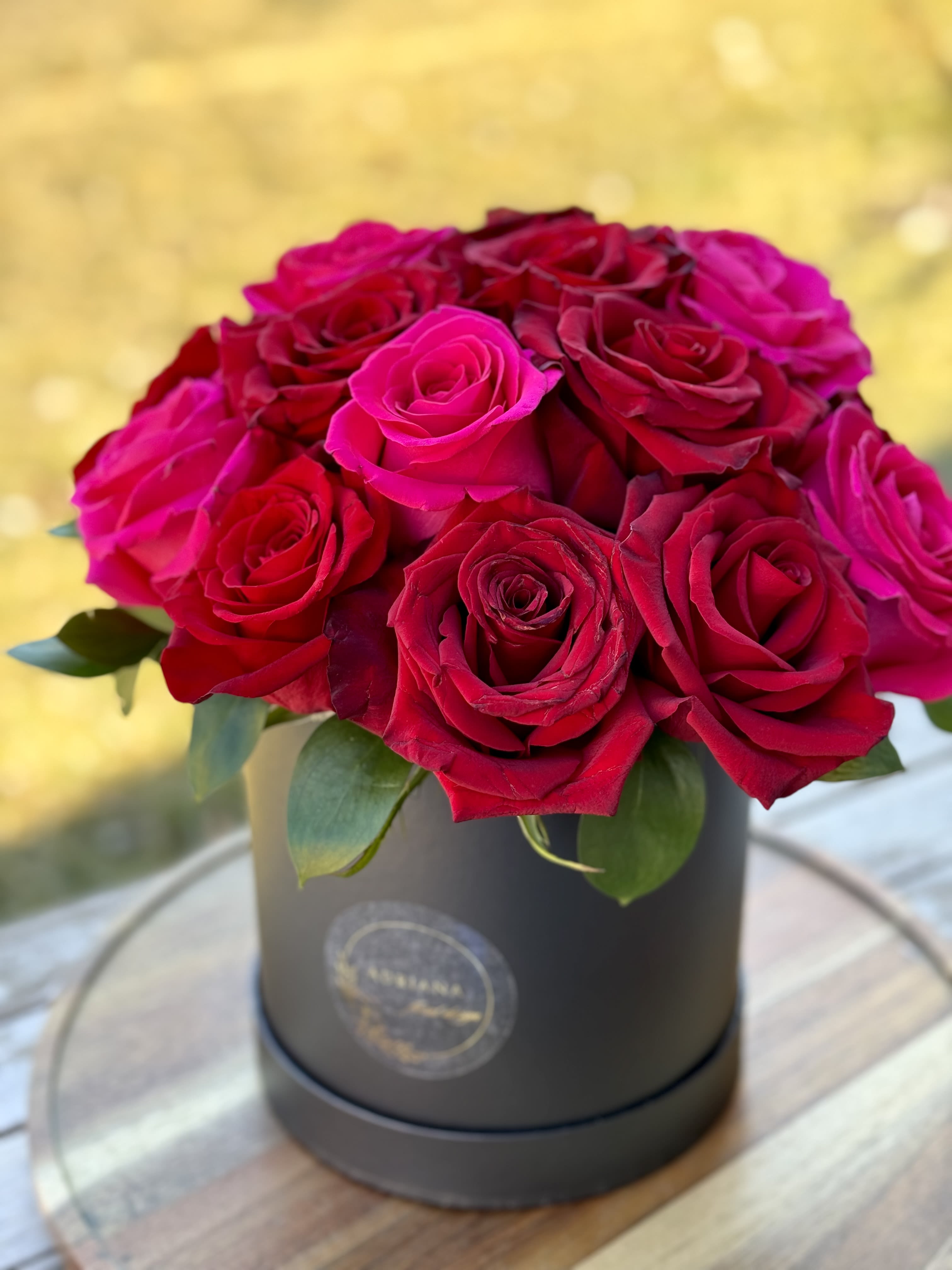 Mixed Dark pink and red roses in a round flower box. Pink and black color of flower box will vary, based on availability