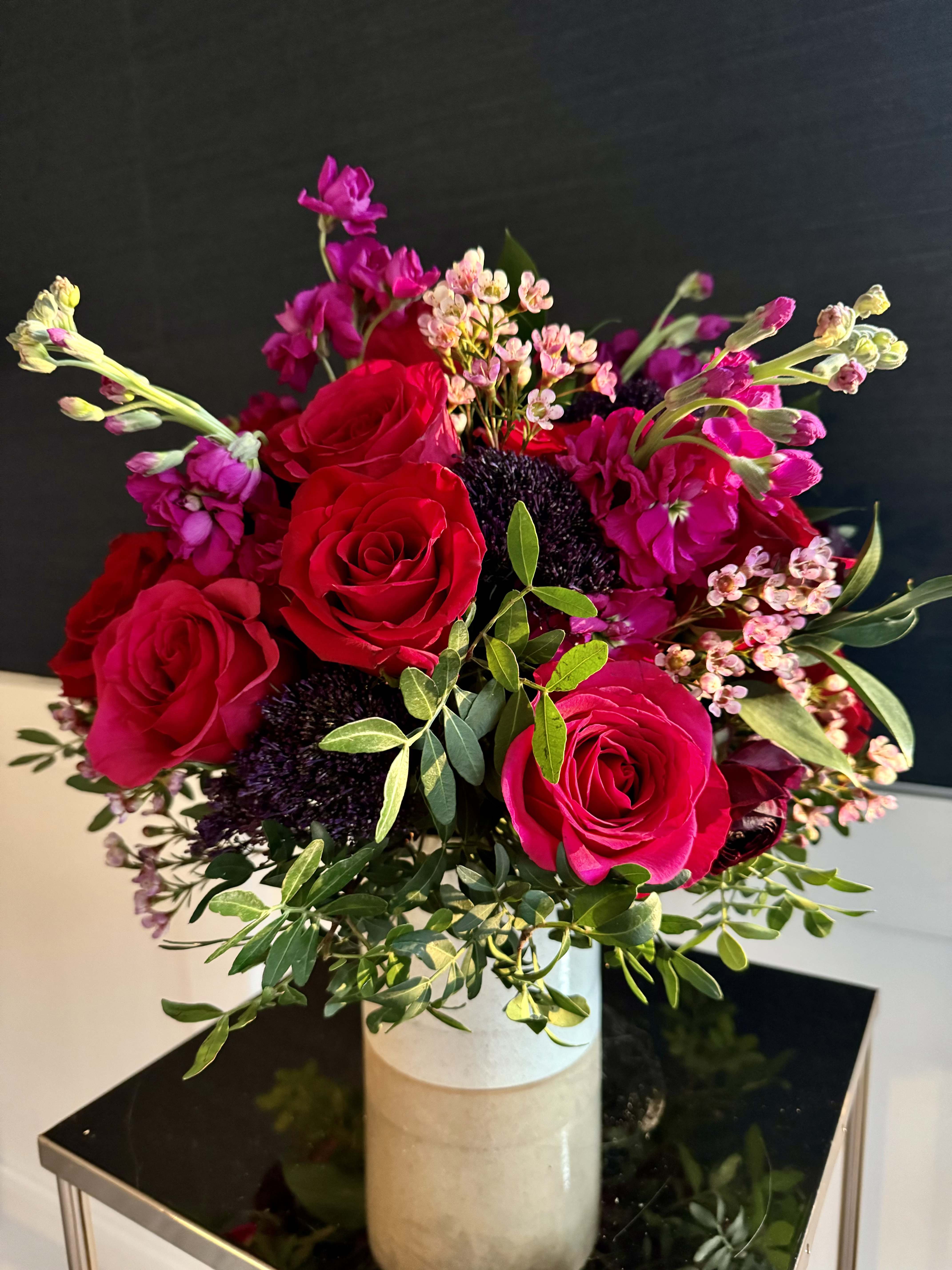 Florist choice mixed arrangement in moody Valentine's Day colors in a premium vase.