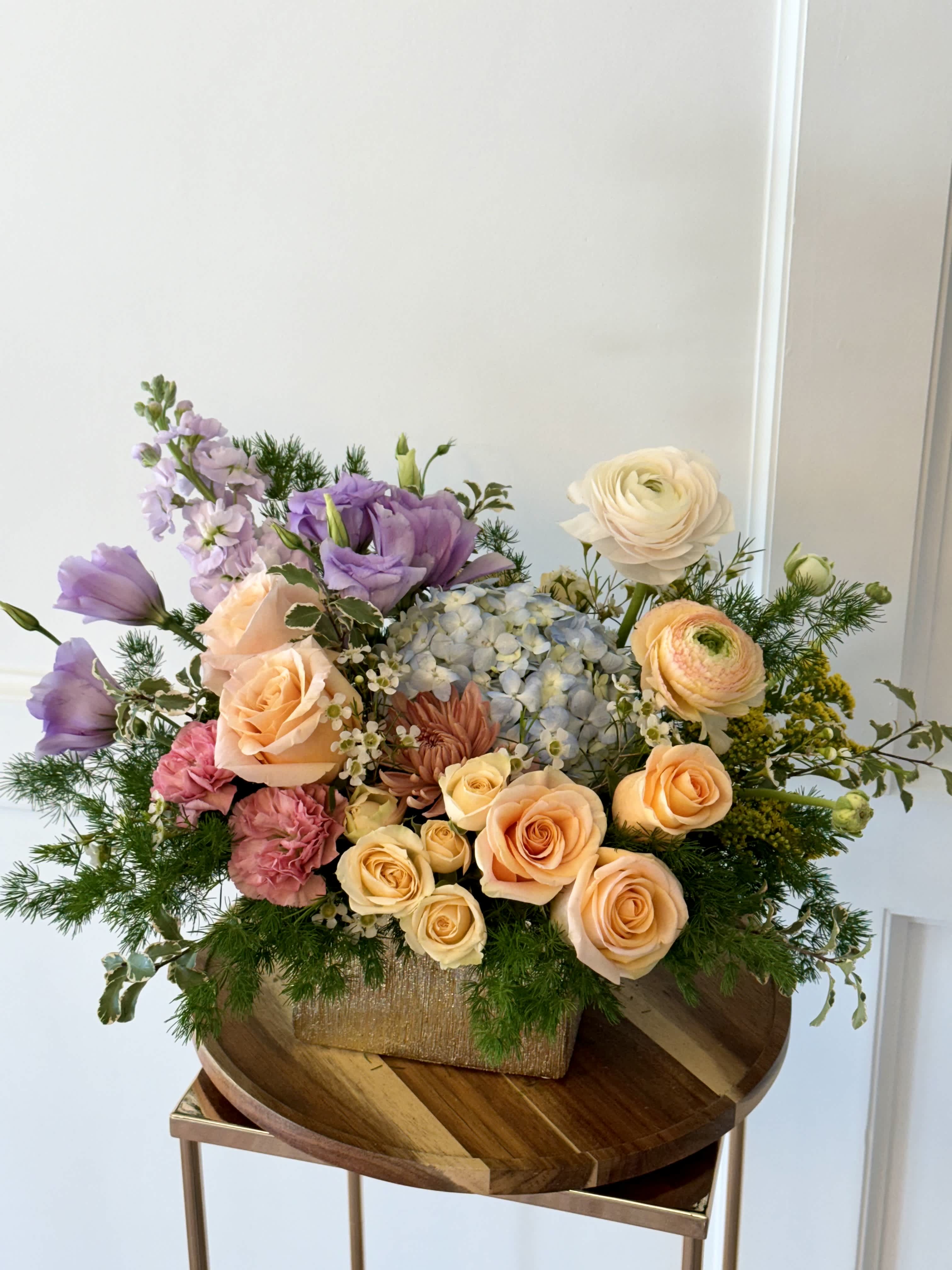A beautiful mix of pastel colors on a bed of greenery. Arrangement includes Hydrangea, Roses, Ranunculus, Carnations and many others.